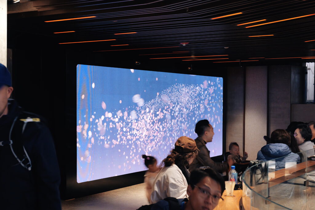공간이 넓다보니 스크린 사이즈가 사진에서는 작게 보이네요. 꽤 큰 화면 입니다. 손님들에게 다양한 힐링을 선사하고 있습니다.